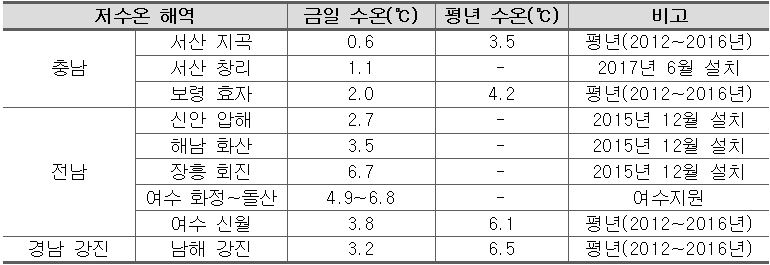 - 전남 득량만 입구(장흥 회진) 6.2~7.2℃, 전남 고흥 나로도 4.6~5.9℃, 경남 진해만 동측(통영 광도면~거제 가조) 4.1~5.0℃ 등으로 낮은 수온이 나타나 주의가 필요함.