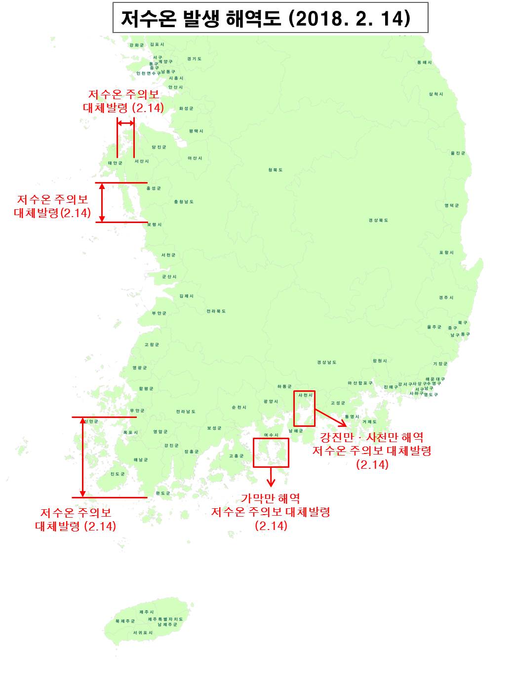 - 저수온 경보에서 주의보 대체 발령 해역 (2018. 2. 14, 14:00부) :