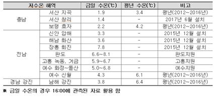 - 전남 득량만 입구(장흥 회진) 7.8℃, 전남 고흥 나로도 5.3℃, 경남 진해만 동측(통영 광도면~거제 가조) 4.7~5.3℃