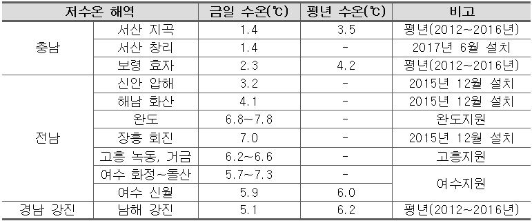 - 전남 득량만 입구(장흥 회진) 6.8~7.2℃, 전남 고흥 나로도 5.7~6.4℃, 경남 진해만 동측(통영 광도면~거제 가조) 4.8~6.1℃ 등으로 낮은 수온이 나타나 주의가 필요함.