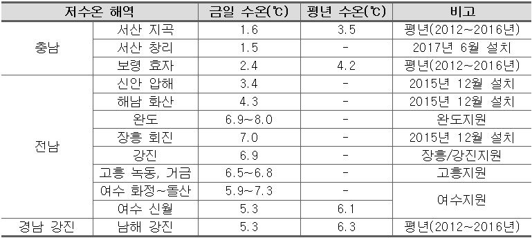 - 전남 서해 해역은 3.8~5.1℃를 나타내고 있고, 남해 해역은 5.3~9.1℃를 나타내고 있음. ※ 전남 해양수산과학원 예찰결과 전남해역은 5.3~8.0℃를 나타냄.