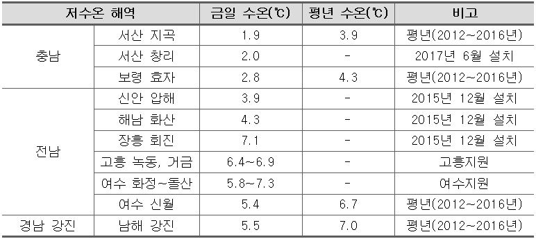 - 금일자로 남해 내만 2개 해역에 대한 특보가 해제되었지만, 장기간 지속된 저수온의 영향으로 양식생물의 관리에 대한 주의가 필요함.