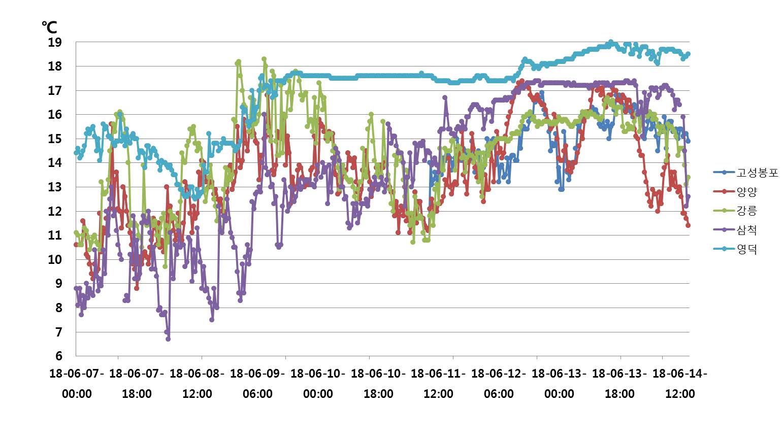 o 6월 14일 14:00 현재, 동해 중부 연안의 표층수온은 전일대비 3~5℃ 하강 하였으며, 주변 연근해역 17~19℃에비해 5∼6℃ 정도 낮게 나타나 동해 중부연안(양양, 강릉, 삼척)에 냉수대 주의보를 발령 합니다. * 6월 14일 14시 고성봉포 14.9℃, 양양 11.4℃, 강릉 13.4℃, 삼척 12.2℃ * 6월 13일 14시 고성봉포 15.5℃, 양양 16.3℃, 강릉 16.6℃, 삼척 17.2℃ o 동해 연안의 냉수대는 강한 남풍계열 바람 유형에 의한 연안용승에 기인한 것으로 판단되며, 남풍계열의 바람이 다음주(6월20일)까지 (기상청 중기예보) 예보되어 수온 변화 추이에 지속적인 관심을 가져 주시기를 바랍니다.