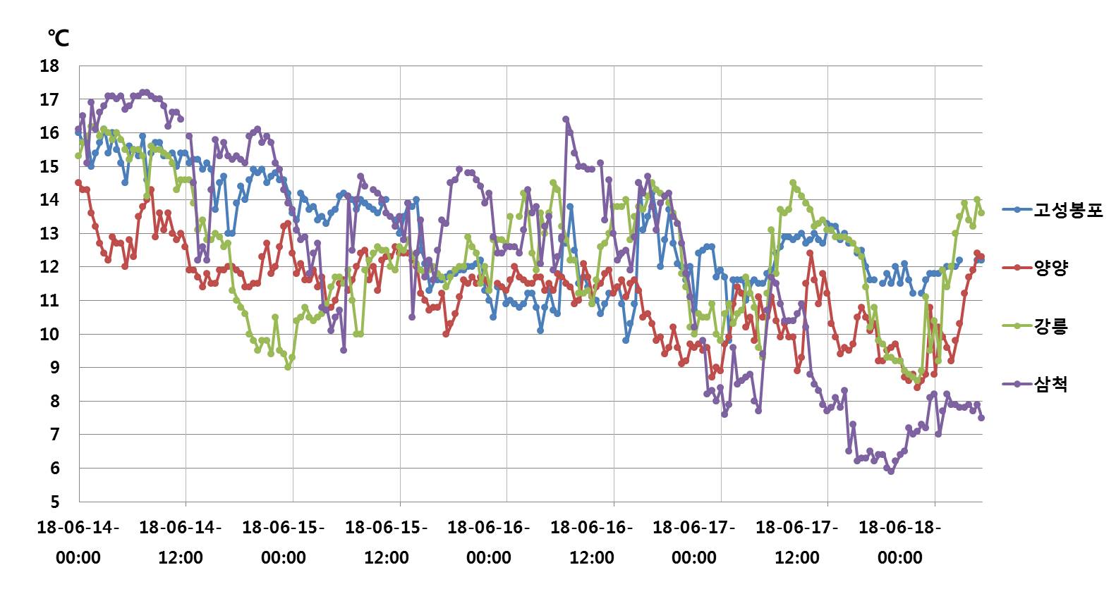 o 지난 6월 14일 동해 중부연안 표층수온이 고성봉포 14.9℃, 양양 11.4℃, 강릉 13.4℃, 삼척12.2℃로 나타나 주의보를 발령한바 있으며, 6월 18일 09:00 현재 삼척연안 표층수온은 7.9℃로 나타나 주변 근해수온(17℃∼18℃)보다 10℃이상 낮게 나타납니다. * 고성봉포, 양양, 강릉, 6월 14일 주의보 발령(해양자료속보, 제5322호)중입니다.