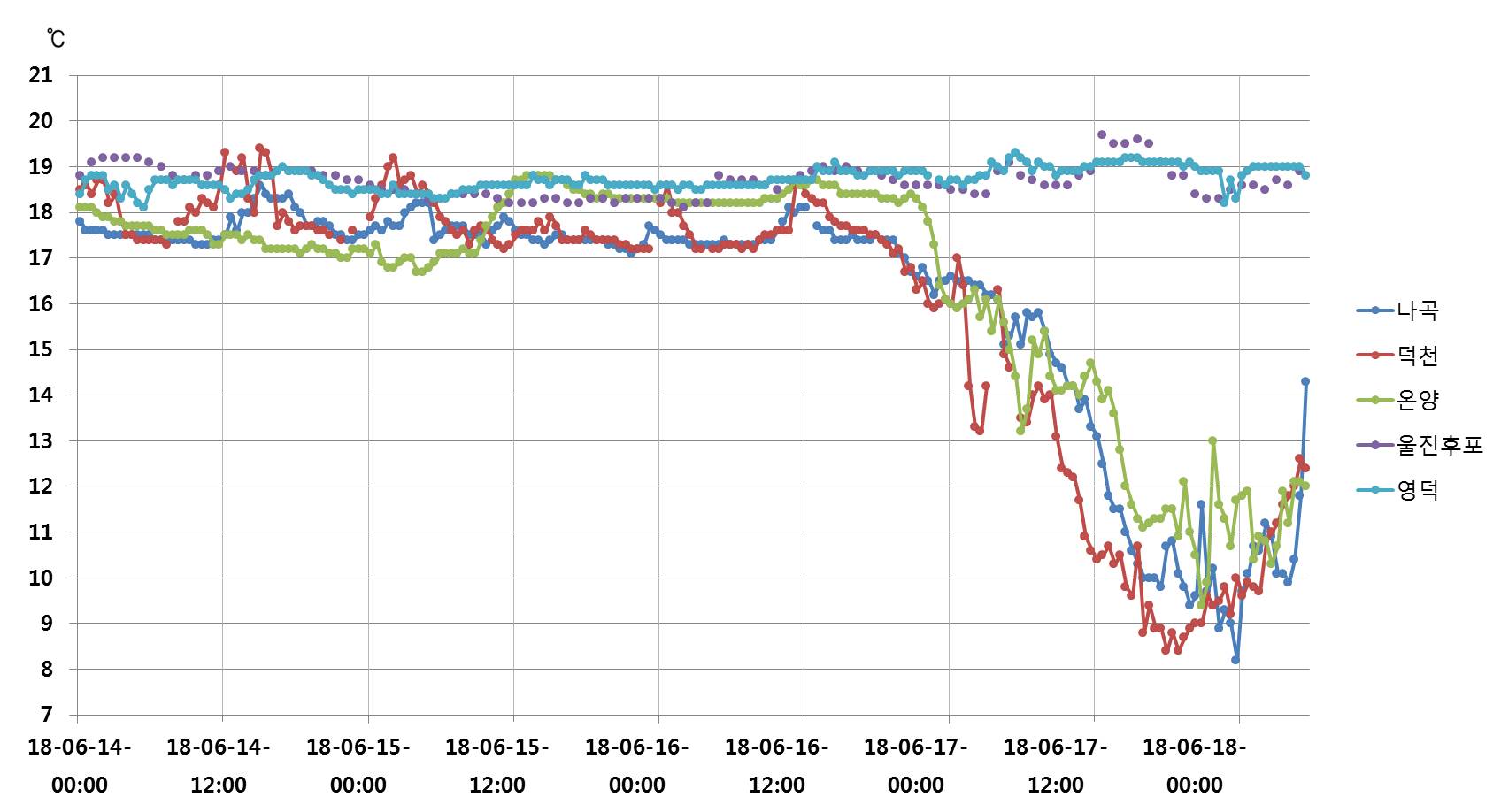 o 6월 18일 09시 현재 나곡 11.8℃, 덕천 12.6℃, 온양 12.1℃ 의 수온을 나타내고 있으며, 주변 연근해역 18~19℃에 비해 6∼7℃ 정도 낮게 나타나 동해 중부연안(나곡, 덕천, 온양)에 냉수대 주의보를 발령 합니다. * 고성봉포, 양양, 강릉, 6월 14일 주의보 발령(해양자료속보, 제5322호)중입니다.