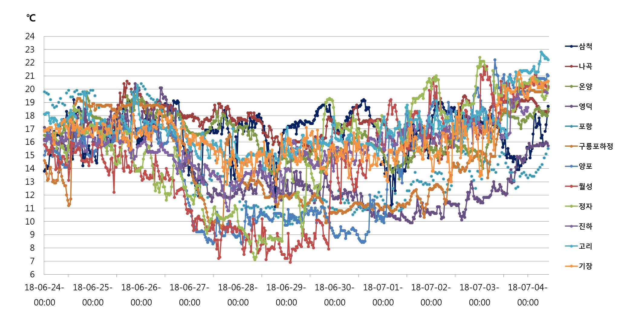 o 동해 중·남부(영덕∼기장)해역에 발생했던 냉수대 경보(구룡포 하정∼정자) 및 주의보(영덕, 포항, 진하, 고리, 기장)를 해제 합니다. * 해양자료속보 제5339호(2018.6.27.), 제5340호(2018.6.27.), 제5341호(2018.6.27.) 관련입니다. o 7월 4일 10시 현재 영덕 16.0℃, 포항 15.5℃, 구룡포 하정 20.1℃, 양포 21.0℃, 월성 20.2℃, 정자 20.6℃, 진하 19.7℃, 고리 22.2℃, 기장 20.6℃의 분포로 수온이 회복을 되었습니다.