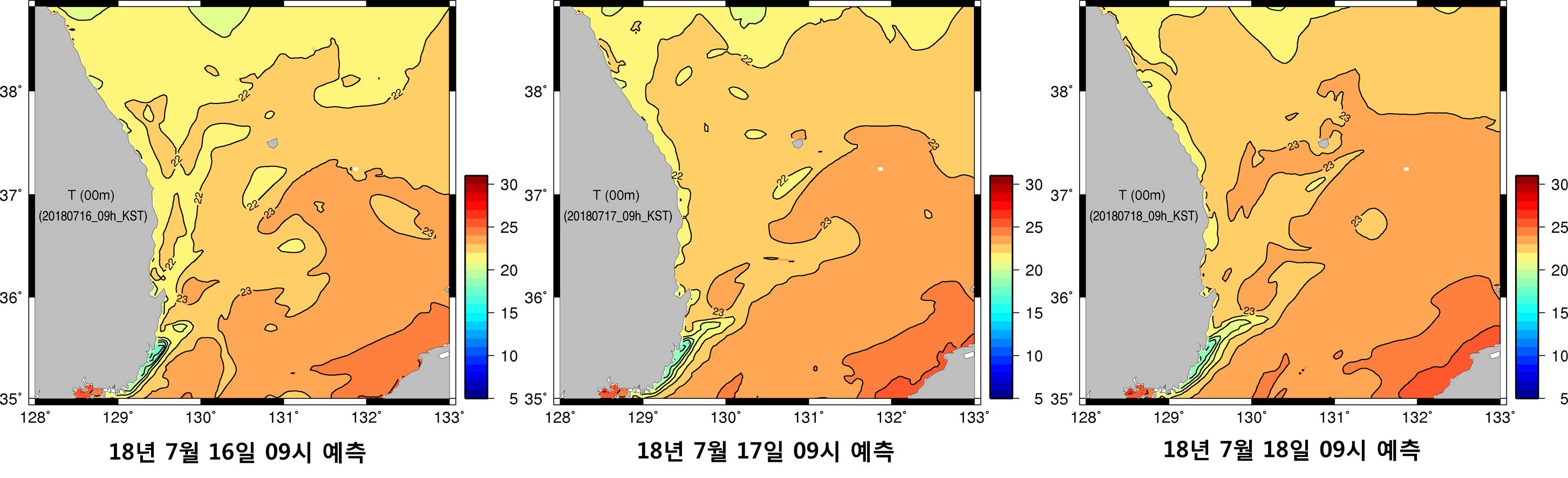 o 7월 16일 14시 현재, 동해남부 연안 해역의 표층수온은 월성 23.3℃, 정자 22.9℃, 진하 19.6℃, 고리 20.0℃, 기장 18.4℃로 근해역 21∼23℃에 비해 3∼4℃정도 낮게 나타납니다.