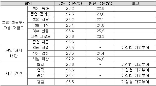 - 금일 09:00 현재 통영 학림도~고흥 거금도 수온은 일부 해역을 제외하고 25~29℃를 나타내고 있으며, 전남 서해 내만은 26~28℃, 제주 연안은 26~27℃를 나타내고 있음.