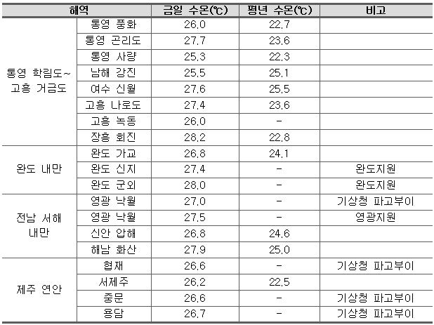 - 남해 연안 : 25.5~28.5℃ 내외로 어제와 비슷한 수준을 보이고 있음.