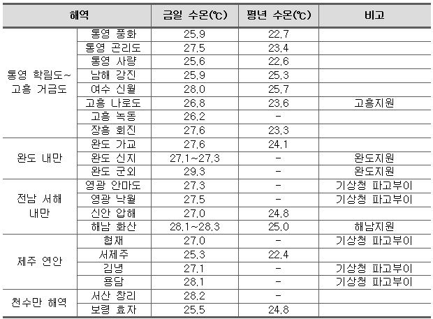 - 고수온에 취약한 어종이 있는 해역에서는 현장지도에 철저를 기하여 주시기 바랍니다.