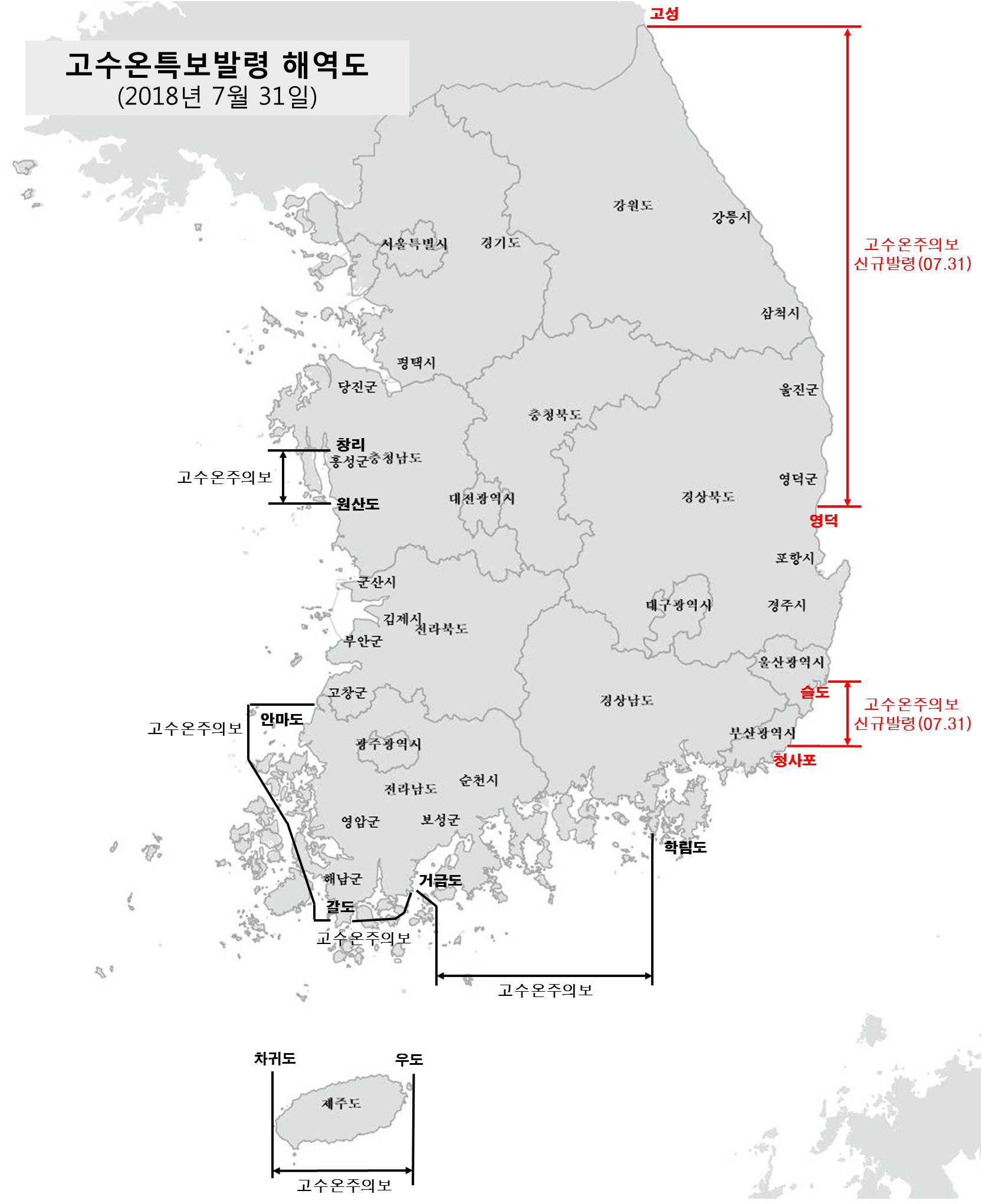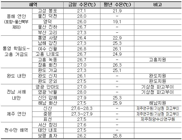 ο 진행상황 - 동해연안 : 26~28℃ 내외로 주말 이후 급격한 수온상승을 보이고 있음. - 남해 연안 : 23.5~27.5℃ 내외로 어제보다 약간 하강한 경향을 보임. - 완도 내만 : 26.0~27.5℃로 어제보다 약간 하강한 경향을 보이고 있음. - 전남 서해 내만 : 27~28℃ 내외로 어제와 비슷한 수준을 보이고 있음. - 제주 연안 : 26~29℃ 내외로 어제와 비슷하거나 약간 상승한 경향을 보임. - 천수만 : 26~28℃ 내외로 어제와 비슷한 경향을 보임. ο 특보상황 - 고수온 주의보 신규 발령 (2018. 7. 31, 14:00) · 동해 연안(강원 고성 군계 북방~경북 영덕 군계 남방/울산 슬도~부산 청사포) - 고수온 주의보 발령 · 충남 천수만(충남 서산시 창리 남측 횡단~충남 보령시 원산도 남측 횡단) (7.26 발령) · 완도 내만(해남 남성방파제~완도 당인리방파제~완도 신지대교~완도 신지도 방파제~완도 조약도 당목항~장흥 노력도 북단) (7.25 발령) · 경남 통영 학림도 서방 종단~전남 고흥 거금도 서방 종단(득량만 포함) (이하 7.24 발령) · 전남 영광 안마도 북방 횡단~전남 해남 갈도 남방 횡단(영광 안마도~신안 재원도~신안 압해도~진도 금호도 서방을 잇는 지선의 외해방향 제외) · 제주 차귀도 서방 종단~제주 우도 동방 종단