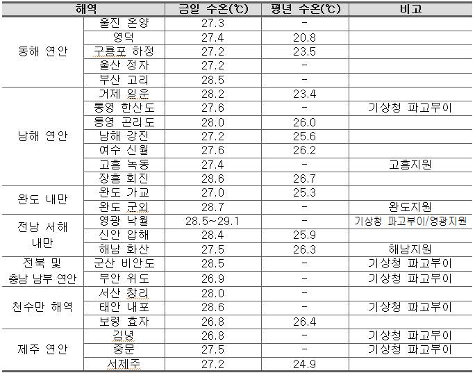 ο 진행상황 - 동해 연안 : 23~29℃로 어제와 비슷하나 약간 낮은 경향을 보임. * 동해연안은 지역적으로 수온차가 크고, 강원연안 중심으로 수온변화가 크게 나타남. - 남해 연안 : 27.0~29.0℃로 어제와 비슷하나 거제도 부근 해역 수온 상승 높음. - 완도 내만 : 27~29℃ 내외로 어제와 비슷함(완도 외측 수온은 어제보다 0.5℃ 내외 상승). - 전남 서해 내만 : 27.5~29.0℃ 내외로 어제와 비슷한 경향. - 전북 및 충남 남부 연안 : 26.5~28.5℃로 어제와 비슷함. - 천수만 : 27.0~28.5℃ 내외로 어제보다 약간 상승하였음. - 제주 연안 : 27~29℃ 내외이나 지역적으로 차이가 많이 남. ο 특보상황 - 고수온 주의보 발령 · 전북 및 충남 남부 연안 (8.3 발령) · 포항~울산 북부/거제~부산 (8.1 발령) · 동해 연안(포항~울산 북부 제외) (7.31 발령) · 충남 천수만 (7.26 발령) · 완도 내만 (7.25 발령) · 경남 통영 학림도 서방 종단~전남 고흥 거금도 서방 종단(득량만 포함) (이하 7.24 발령) · 전남 영광 안마도 북방 횡단~전남 해남 갈도 남방 횡단 · 제주 차귀도 서방 종단~제주 우도 동방 종단