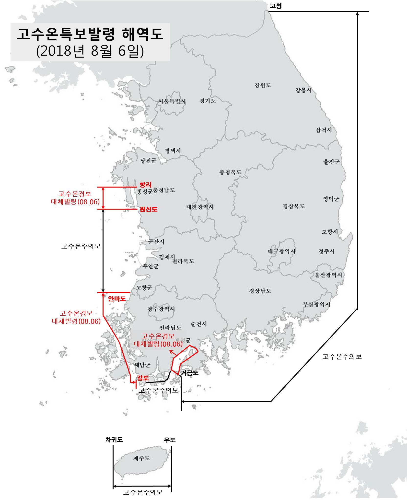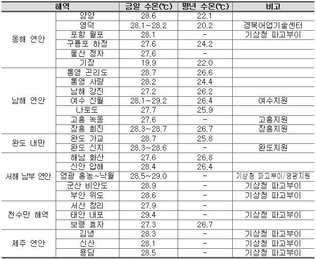 ο 고수온 발생 현황 - 조사월일 : 2018년 8월 6일(월) - 고수온 해역: ※ 금일수온은 00:00~14:00 평균 수온, 기상청 파고부이는 측정수심에 의해 1℃ 내외 높게 측정될 가능성이 있음 ο 진행상황 - 동해 연안 : 28~29℃이나, 냉수대가 발생한 울산~부산연안은 19~25℃를 보임. - 남해 연안 : 27.5~29.5℃로 어제와 비슷하거나 약간 상승함. - 완도 내만 : 28.5~29.5℃로 어제보다 약간 상승함(완도 외측 수온도 어제보다 0.5℃ 내외 상승). - 서해남부 연안 : 28.0~29.0℃로 어제와 비슷하거나 약간 상승함. - 천수만 : 28.0~29.5℃ 내외로 어제보다 약간 상승하였음. - 제주 연안 : 27~29℃로 어제와 비슷하거나 약간 상승함. ο 특보상황 - 고수온 경보 발령 (2018. 8. 6, 15:00) · 천수만, 득량만, 전남 서해남부내만(영광 안마도 북방 횡단~전남 해남 갈도 남방 횡단) - 고수온 주의보 발령 · 전북 및 충남 남부 연안(충남 보령시 원산도 남측~전남 영광 안마도 북방) (8.3 발령) · 포항~울산(경북 영덕 남방~울산 슬도)/거제~부산(통영 학림도~부산 청사포) (8.1 발령) · 동해 연안(포항~울산 제외) (7.31 발령) · 완도 내만 (7.25 발령) · 경남 통영 학림도 서방 종단~전남 고흥 거금도 서방 종단 (이하 7.24 발령) · 제주 차귀도 서방 종단~제주 우도 동방 종단 ο 금후전망 - 내일까지 소조기의 영향으로 완도 동측 외곽 도서 등 남해 서부 연안은 수온이 서서히 상승한 이후, 주말 경 대조기에 접어들면서 소강상태를 보일 것으로 전망. - 동해연안은 오늘까지 부산~울산 연안을 중심으로 나타난 냉수대가 소멸될 예정이며, 이후 강한 북동풍 영향에 의하여 수온 상승이 우려됨. - 오늘과 내일, 동해연안과 내륙을 중심으로 소나기 예보가 있으나 수온 하강에는 큰 영향을 주지 못할 것으로 판단되며 8월 중순 이후까지 고수온 경향을 보일 것으로 전망됨. ο 당부사항 - 수산사무소 및 지자체에서는 고수온 기동 예찰 및 현장 지도활동에 철저를 기해 주시기 바랍니다. - 특보 발령해역 어업인께서는 양식장 관리요령에 따라 양식장 관리에 철저를 기해주시기 바랍니다. - 동해 남부연안은 냉수대 소멸 이후 급격한 수온 상승에 철저히 대비하여 주시기 바랍니다. ο 고수온 특보 발령 해역도
