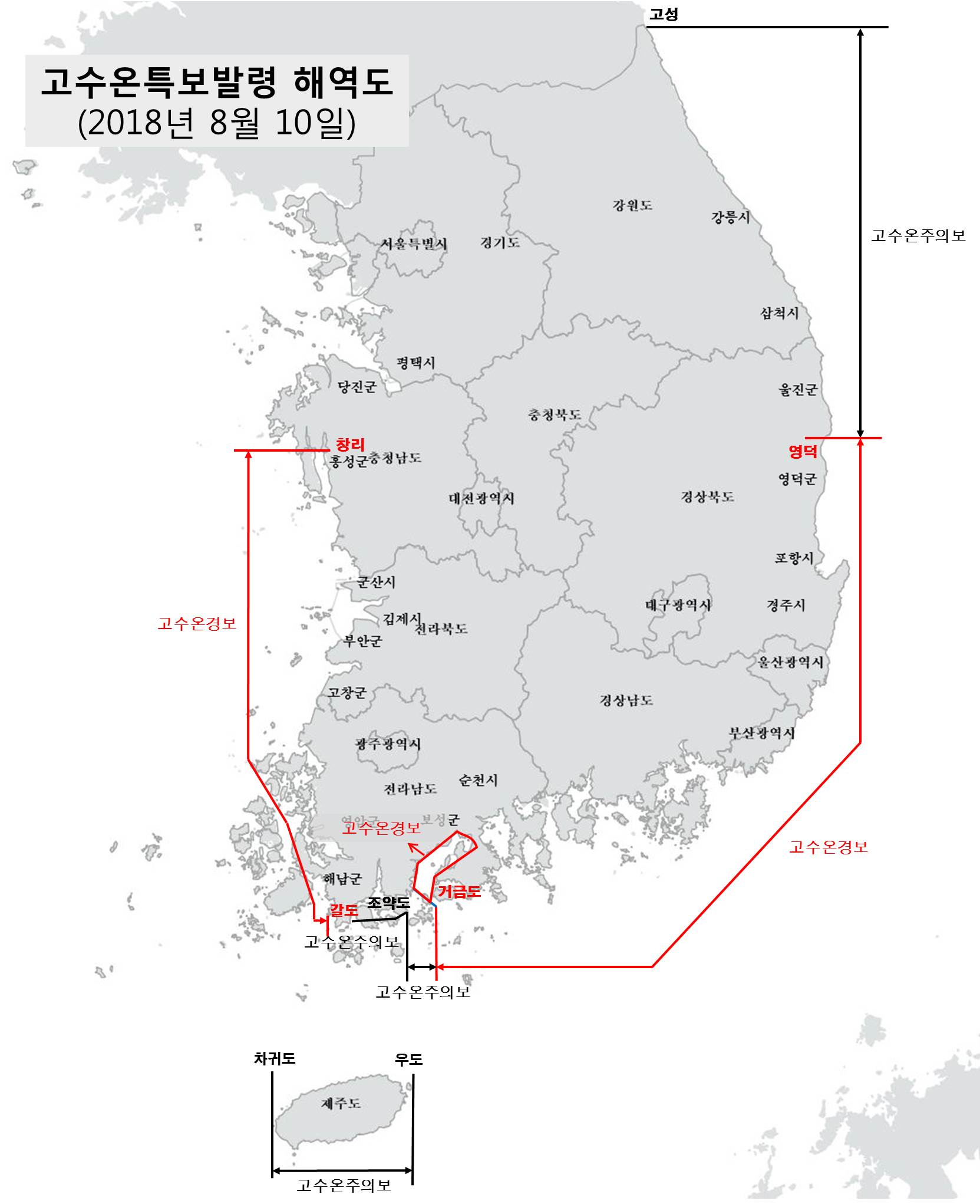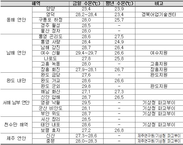 ο 고수온 발생 현황 - 조사월일 : 2018년 8월 10일(금) - 고수온 해역: ※ 금일수온은 00:00~14:00 평균 수온, 기상청 파고부이는 측정수심에 의해 1℃ 내외 높게 측정될 가능성이 있음 ο 진행상황 - 동해 연안 : 28~29℃이나, 경북 북부~강원 연안은 냉수대 영향으로 19~26℃ 내외를 보임. - 남해 연안 : 28.0~30.0℃로 어제와 비슷한 경향을 나타냄. - 완도 내만/동측 : 완도내만 28~30℃, 완도 동측해역 26~28℃ 내외를 나타냄. - 서해남부 연안 : 27.0~30.0℃로 어제와 비슷한 경향을 나타냄. - 천수만 : 28.0~29.0℃로 어제와 비슷한 경향을 나타냄. - 제주 연안 : 26.0~29.0℃로 어제와 비슷함. ο 특보상황 - 고수온 경보 발령 · 경북 영덕 군계 북방~전남 고흥 거금도 서측 종단 (8.9 발령) · 전북 및 충남 남부 연안(충남 보령 원산도 남측~전남 영광 안마도 북방) (8.9 발령) · 천수만, 득량만, 전남 서해남부내만 (8.6 발령) - 고수온 주의보 발령 · 완도 내만 (7.25 발령) 및 완도 동측 외곽 도서 (8.7 발령) · 강원 고성 군계 북방~경북 영덕 군계 북방 (7.31 발령) · 제주 차귀도 서방 종단~제주 우도 동방 종단 (7.24 발령)