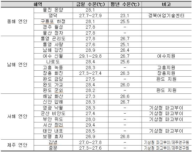 ※ 금일수온은 00:00~14:00 평균 수온, 기상청 파고부이는 측정수심에 의해 1℃ 내외 높게 측정될 가능성이 있음 ο 진행상황 - 동해 연안 : 27.5~28.5℃로 어제와 비슷하거나 약간 하강함 (강원 연안 냉수대 존재). - 남해 연안(완도내만) : 27.5∼29.5℃ 내외로 어제와 비슷하거나 약간 하강함. - 서해 연안(천수만) : 27.0~29.5℃로 어제와 비슷함. - 제주 연안 : 26.0~28.0℃로 어제와 비슷하거나 약간 하강함. ο 특보상황 - 고수온 경보 발령 · 경북 영덕 군계 북방~전남 고흥 거금도 서측 종단 (8.9 발령) · 전북 및 충남 남부 연안(충남 보령 원산도 남측~전남 영광 안마도 북방) (8.9 발령) · 천수만, 득량만, 전남 서해남부내만 (8.6 발령) - 고수온 주의보 발령 · 완도 내만 (7.25 발령) 및 완도 동측 외곽 도서 (8.7 발령) · 강원 고성 군계 북방~경북 영덕 군계 북방 (7.31 발령) · 제주 차귀도 서방 종단~제주 우도 동방 종단 (7.24 발령) ο 금후전망 - 남해 연안은 오늘과 내일, 강우와 강풍에 따라 수온 상승이 소강상태를 보일 것으로 판단됨. - 동해는 강원 일부 해역에 냉수대 출현이 지속되고 있으나, 동해 외해상의 저기압 영향으로 내일부터 강한 북동풍이 예상되어 향후 수일간 수온 변동폭이 크게 나타날 수 있음. ο 당부사항 - 수산사무소 및 지자체에서는 고수온 기동 예찰 및 현장 지도활동에 철저를 기해 주시기 바랍니다. - 고수온 특보 장기화에 따라 특보 발령해역 어업인께서는 양식어류의 철저한 관리가 요구됩니다. - 동해 연안은 바람 예측 변동성이 크게 바뀌고 있어, 수온 정보에 주의 깊은 관심이 필요합니다. ο 고수온 특보 발령 해역도
