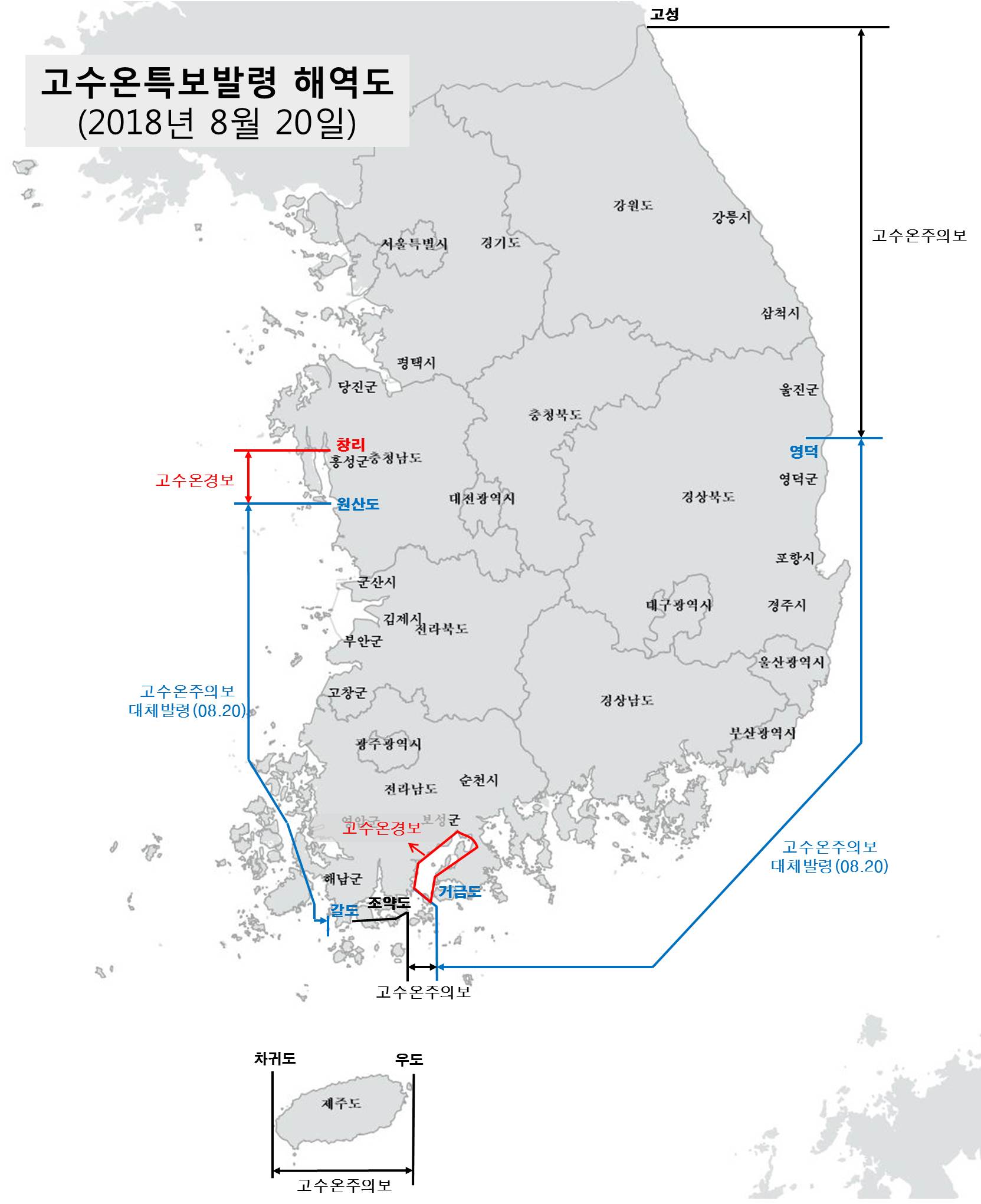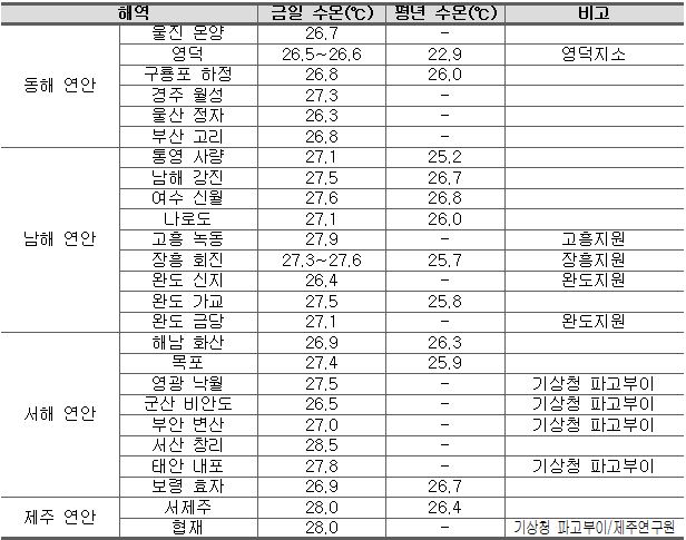 ο 고수온 발생 현황 - 조사월일 : 2018년 8월 20일(월) - 고수온 해역: ※ 금일수온은 00:00~14:00 평균 수온, 기상청 파고부이는 측정수심에 의해 1℃ 내외 높게 측정될 가능성이 있음 ο 진행상황 - 동해 연안 : 25.5~27.5℃로 어제와 비슷함 (강원 연안 간헐적 냉수대 출현중). - 남해 연안(완도내만) : 26.5∼28.0℃로 어제와 비슷하거나 하강함. - 서해 연안(천수만) : 26.5~28.5℃로 어제와 비슷하거나 하강함. - 제주 연안 : 25.0~28.0℃로 어제와 비슷한 경향을 보임. ο 특보상황 - 고수온 주의보 대체 발령 (2018. 8. 20, 15:00부) · 경북 영덕 군계 북방~전남 고흥 거금도 서측 종단 · 충남 보령 원산도 남측~전남 해남 갈도 남방 횡단 - 고수온 경보 발령 · 천수만, 득량만 (8.6 발령) - 고수온 주의보 발령 · 완도 내만 (7.25 발령) 및 완도 동측 외곽 도서 (8.7 발령) · 강원 고성 군계 북방~경북 영덕 군계 북방 (7.31 발령) · 제주 연안 (7.24 발령)