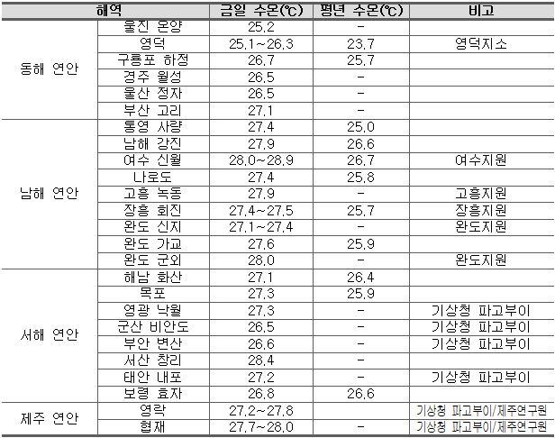 ο 고수온 발생 현황 - 조사월일 : 2018년 8월 21일(화) - 고수온 해역: ※ 금일수온은 00:00~14:00 평균 수온, 기상청 파고부이는 측정수심에 의해 1℃ 내외 높게 측정될 가능성이 있음 ο 진행상황 - 동해 연안 : 25.0~27.5℃로 어제와 비슷함 (경북 북부~강원 연안 냉수대 출현중). - 남해 연안(완도내만) : 27.0∼28.5℃로 어제와 비슷하거나 약간 상승함. - 서해 연안(천수만) : 26.5~28.5℃로 어제와 비슷함. - 제주 연안 : 25.0~28.0℃로 어제와 비슷한 경향을 보임. ο 특보상황 - 고수온 경보 발령 · 천수만, 득량만 (8.6 발령) - 고수온 주의보 발령 · 경북 영덕 군계 북방~전남 고흥 거금도 서측 종단 (8.20 발령) · 충남 보령 원산도 남측~전남 해남 갈도 남방 횡단 (8.20 발령) · 완도 내만 (7.25 발령) 및 완도 동측 외곽 도서 (8.7 발령) · 강원 고성 군계 북방~경북 영덕 군계 북방 (7.31 발령) · 제주 연안 (7.24 발령) ο 금후전망 - 동해연안은 해역에 따라 강한 냉수대 출현과 소멸이 나타날 수 있으며, 남해, 서해, 제주 연안은 태풍 통과 이전까지 남풍/동풍 계열의 바람으로 일시적인 수온 상승이 나타날 수 있음. - 우리나라 전 연안은 수요일~금요일까지 태풍 19호의 직접적 영향, 동해연안은 목~일요일까지 태풍 20호의 간접적 영향으로 수온 변화가 크게 나타날 수 있음. ※ 태풍 내습에 따른 일부 관측소 피항으로 수온정보 수신이 불가능한 해역이 발생할 수 있음. ο 당부사항 - 수산사무소 및 지자체에서는 고수온 기동 예찰 및 현장 지도활동에 철저를 기해 주시기 바랍니다. - 특보 발령해역 어업인께서는 양식장 관리요령에 따라 양식어류의 철저한 관리가 요구됩니다. - 동해 연안은 냉수대 출현/소멸에 따른 급격한 수온 변화에 주의가 필요하며, 전 해역의 해상양식장에서는 이번 주 내습하는 태풍에 대한 철저한 대비가 필요합니다. ο 고수온 특보 발령 해역도