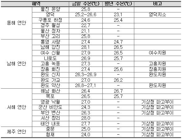 ※ 금일수온은 00:00~14:00 평균 수온, 기상청 파고부이는 측정수심에 의해 1℃ 내외 높게 측정될 가능성이 있음 ο 진행상황 - 동해 연안 : 21.0~27.0℃로 어제보다 큰 폭 하락(기장~포항사이 강한 냉수대 출현). - 남해 연안(완도내만) : 26.5∼28.0℃로 어제보다 0.5~1.0℃ 하락함. - 서해 연안(천수만) : 24.5~28.0℃로 어제보다 0.5~1.5℃ 하락함. - 제주 연안 : 21.0~25.0℃로 어제보다 큰 폭으로 하락하였으며 지역적 편차가 큼. ο 특보상황 - 고수온 경보 발령 · 천수만, 득량만 (8.6 발령) - 고수온 주의보 발령 · 경북 영덕 군계 북방~전남 고흥 거금도 서측 종단 (8.20 발령) · 충남 보령 원산도 남측~전남 해남 갈도 남방 횡단 (8.20 발령) · 완도 내만 (7.25 발령) 및 완도 동측 외곽 도서 (8.7 발령) · 강원 고성 군계 북방~경북 영덕 군계 북방 (7.31 발령) · 제주 연안 (7.24 발령) ο 금후전망 - 동해연안은 태풍 19호 통과에 따른 바람패턴의 영향으로 포항 이남 해역에서는 강한 냉수대 출현이 2~3일 지속될 수 있으며, 서해와 남해 연안은 태풍 통과 여파로 당분간 수온 상승이 소강상태를 보일 것으로 전망됨. - 제주 연안은 전반적으로 큰 폭으로 수온이 하강하였으며, 지역적으로 낮은 수온이 나타날 수 있음. ※ 태풍 내습에 따른 영향으로 일부 해역의 수온정보 수신이 수일간 불가능한 해역이 발생하고 있음. ο 당부사항 - 수산사무소 및 지자체에서는 고수온 기동 예찰 및 현장 지도활동에 철저를 기해 주시기 바랍니다. - 특보 발령해역 어업인께서는 양식장 관리요령에 따라 양식어류의 철저한 관리가 요구됩니다. - 동해 중남부 연안은 냉수대 출현/소멸에 따른 수온변화에 철저한 주의가 필요하며, 그 외 해역에서도 수온변화가 크게 나타날 수 있음으로 주의가 필요함. ο 고수온 특보 발령 해역도