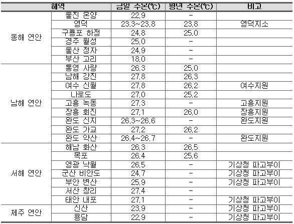 ※ 금일수온은 00:00~14:00 평균 수온, 기상청 파고부이는 측정수심에 의해 1℃ 내외 높게 측정될 가능성이 있음 ο 진행상황 - 동해 연안 : 18.0~25.5℃로 어제보다 하강함 (포항~부산 냉수대 주의보 발효중). - 남해 연안(완도내만) : 26.0∼28.0℃로 어제보다 약간 하강함. - 서해 연안(천수만) : 24.5~27.5℃로 어제보다 하강함. - 제주 연안 : 20.0~24.0℃로 어제와 비슷하며 지역적 편차가 크게 나타남. ο 특보상황 - 고수온 경보 발령 · 천수만, 득량만 (8.6 발령) - 고수온 주의보 발령 · 경북 영덕 군계 북방~전남 고흥 거금도 서측 종단 (8.20 발령) · 충남 보령 원산도 남측~전남 해남 갈도 남방 횡단 (8.20 발령) · 완도 내만 (7.25 발령) 및 완도 동측 외곽 도서 (8.7 발령) · 강원 고성 군계 북방~경북 영덕 군계 북방 (7.31 발령) · 제주 연안 (7.24 발령) ο 금후전망 - 우리나라 전 연안은 태풍 이후 폭염 소강상태로 인하여 전반적으로 수온이 하강하였으며, 향후에도 큰 폭의 수온상승 가능성은 낮음. - 동해연안은 기단의 불안정으로 바람 패턴의 극심한 변화로 강한 냉수대의 출현과 소멸이 향후 수일간 반복될 것으로 예상됨. ※ 주말 이후 경보→주의보 대체(천수만/득량만) 및 주의보 해제(동해, 제주연안 등)를 검토 예정 ο 당부사항 - 수산사무소 및 지자체에서는 고수온 기동 예찰 및 현장 지도활동에 철저를 기해 주시기 바랍니다. - 특보 발령해역 어업인께서는 양식장 관리요령에 따라 양식어류의 철저한 관리가 요구됩니다. - 동해 연안 양식장에서는 강한 냉수대 발생과 소멸에 따른 급격한 수온변화에 주의가 필요합니다. ο 고수온 특보 발령 해역도
