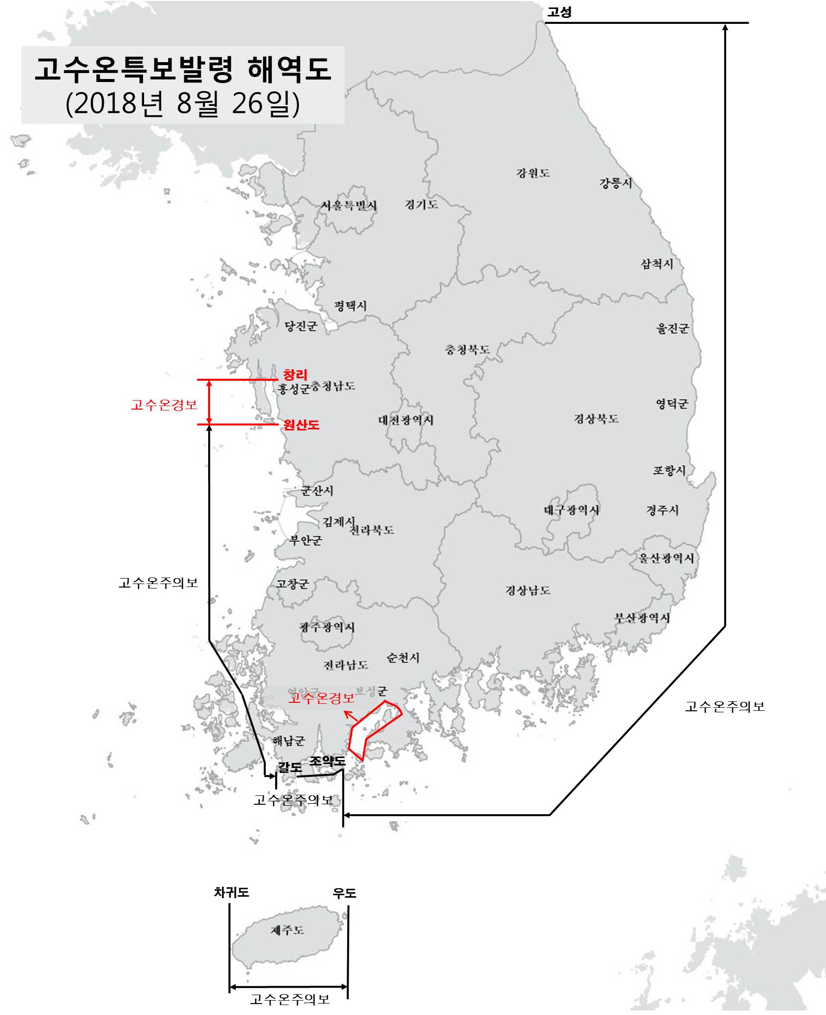 ο 고수온 발생 현황 - 조사월일 : 2018년 8월 26일(일) - 고수온 해역: