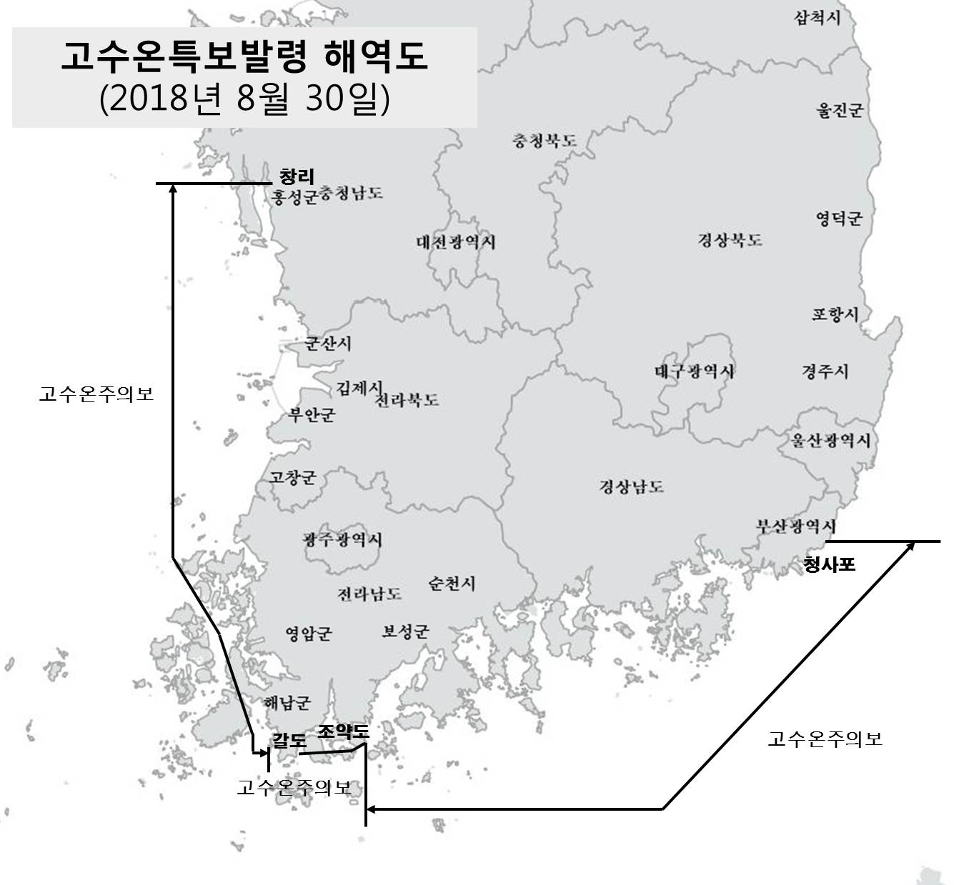 ο 고수온 발생 현황 - 조사월일 : 2018년 8월 30일(목) - 고수온 해역: ※ 금일수온은 00:00~14:00 평균 수온, 기상청 파고부이는 측정수심에 의해 1℃ 내외 높게 측정될 가능성이 있음 ο 진행상황 - 남해 연안(완도내만 포함) : 24.4∼28.6℃로 어제와 비슷함. - 서해 연안(천수만 포함) : 25.6~27.0℃로 어제와 비슷함. ο 특보상황 - 고수온 주의보 발령 · 천수만, 득량만 (8.27 대체발령) · 부산 청사포~전남 고흥 거금도 서측 종단 (8.20 대체발령) · 충남 보령 원산도 남측~전남 해남 갈도 남방 횡단 (8.20 대체발령) · 완도 내만 (7.25 발령) 및 완도 동측 외곽 도서 (8.7 발령) ο 금후전망 - 가을 장마전선이 남하하여 주말까지 서해 및 남해안에 영향을 미칠 것으로 예보됨에 따라 수온상승 가능성은 낮을 것으로 전망됨. ※ 수온변동 경향 분석 후 나머지 해역 주의보 해제 검토 예정 ο 당부사항 - 수산사무소 및 지자체에서는 고수온 기동 예찰 및 현장 지도활동에 철저를 기해 주시기 바랍니다. - 특보 발령해역 어업인께서는 양식장 관리요령에 따라 양식어류의 철저한 관리가 요구됩니다. - 동해 연안 양식장에서는 냉수대 발생과 소멸에 따른 급격한 수온변화에 주의가 필요합니다. ο 고수온 특보 발령 해역도