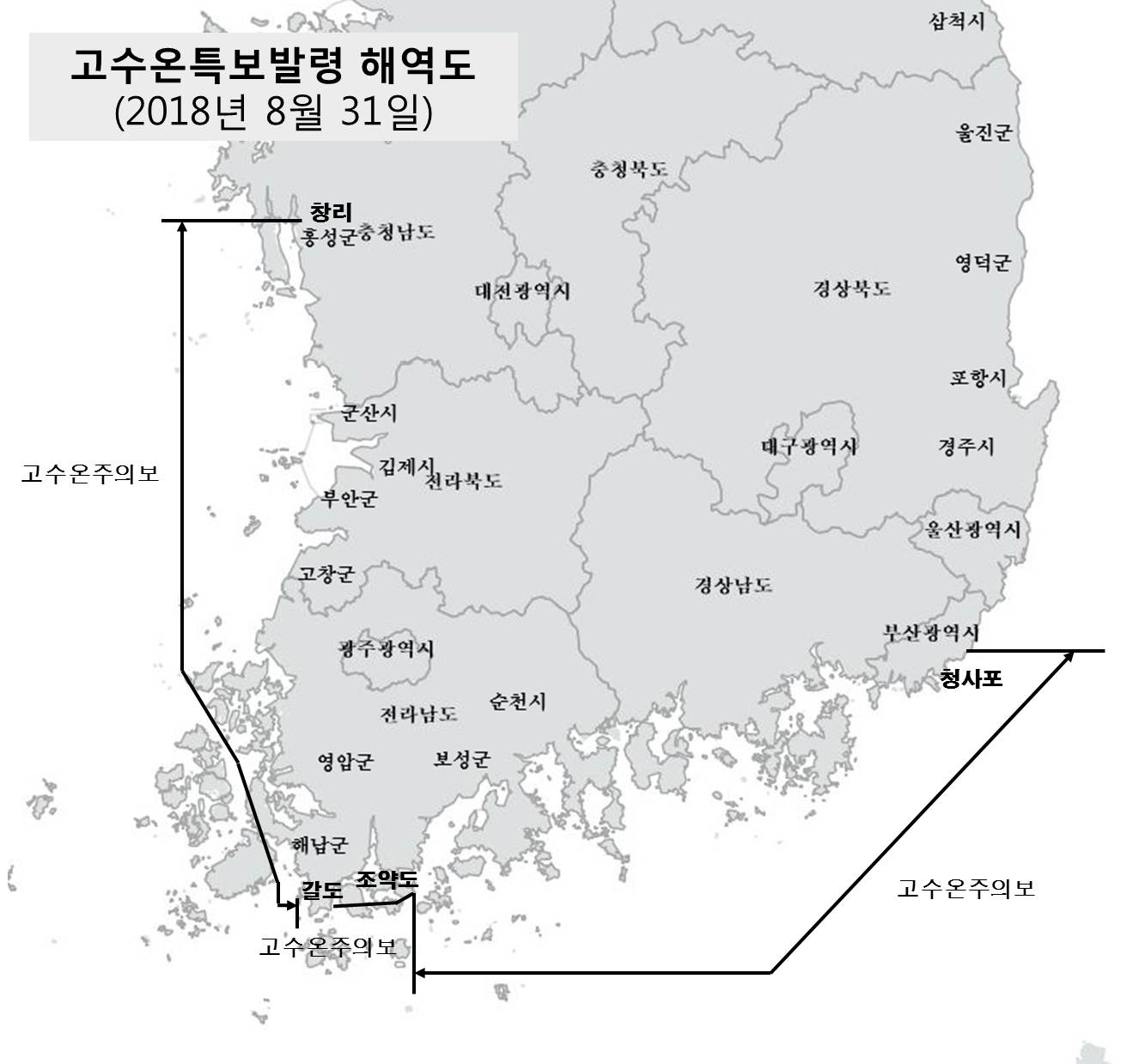 ο 고수온 발생 현황 - 조사월일 : 2018년 8월 31일(금) - 고수온 해역: ※ 금일수온은 00:00~14:00 평균 수온, 기상청 파고부이는 측정수심에 의해 1℃ 내외 높게 측정될 가능성이 있음 ο 진행상황 - 남해 연안(완도내만 포함) : 25.4∼28.6℃로 어제와 비슷함. - 서해 연안(천수만 포함) : 25.5~27.1℃로 어제와 비슷함. ο 특보상황 - 고수온 주의보 발령 · 천수만, 득량만 (8.27 대체발령) · 부산 청사포~전남 고흥 거금도 서측 종단 (8.20 대체발령) · 충남 보령 원산도 남측~전남 해남 갈도 남방 횡단 (8.20 대체발령) · 완도 내만 (7.25 발령) 및 완도 동측 외곽 도서 (8.7 발령) ο 금후전망 - 주말까지 남부지방을 중심으로 대체로 흐리거나 비가 내리고, 중부지방도 가끔 구름이 많을 것으로 전망되어, 수온상승 가능성은 낮을 것으로 전망됨. ※ 수온변동 경향 분석 후 나머지 해역 주의보 해제 검토 예정 ο 당부사항 - 수산사무소 및 지자체에서는 고수온 기동 예찰 및 현장 지도활동에 철저를 기해 주시기 바랍니다. - 특보 발령해역 어업인께서는 양식장 관리요령에 따라 양식어류의 철저한 관리가 요구됩니다. - 동해 연안 양식장에서는 냉수대 발생과 소멸에 따른 급격한 수온변화에 주의가 필요합니다. ο 고수온 특보 발령 해역도