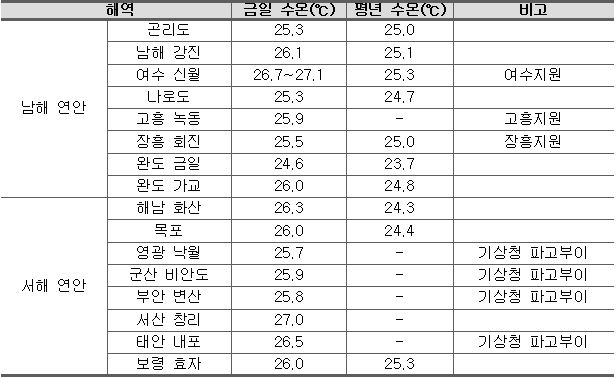 ο 고수온 발생 현황 - 조사월일 : 2018년 9월 3일(월) - 고수온 해역: ※ 금일수온은 00:00~14:00 평균 수온, 기상청 파고부이는 측정수심에 의해 1℃ 내외 높게 측정될 가능성이 있음 ο 진행상황 - 남해 연안(완도내만 포함) : 24.5∼27.0℃로 어제보다 소폭 하강함. - 서해 연안(천수만 포함) : 25.5~27.0℃로 어제와 비슷하거나 소폭 하강함. ο 특보상황 - 고수온 주의보 발령 · 천수만, 득량만 (8.27 대체발령) · 부산 청사포~전남 고흥 거금도 서측 종단 (8.20 대체발령) · 충남 보령 원산도 남측~전남 해남 갈도 남방 횡단 (8.20 대체발령) · 완도 내만 (7.25 발령) 및 완도 동측 외곽 도서 (8.7 발령) ο 금후전망 - 기상청 중기 전망에 따르면 9월 중순까지 최고기온 26~29℃, 최저기온 20℃ 내외로 수온 상승 가능성은 낮음. - 동해 연안은 제21호 태풍의 간접 영향으로 냉수대 출현/소멸 등 수온변화가 크게 나타날 수 있음. ※ 이번 주 수온 변동 경향 확인 후, 전 해역 주의보 해제 검토 예정 ο 당부사항 - 수산사무소 및 지자체에서는 고수온 기동 예찰 및 현장 지도활동에 철저를 기해 주시기 바랍니다. - 특보 발령해역 어업인께서는 양식장 관리요령에 따라 양식어류의 철저한 관리가 요구됩니다. - 동해 연안 양식장에서는 냉수대 발생과 소멸에 따른 급격한 수온변화에 주의가 필요합니다. ο 고수온 특보 발령 해역도