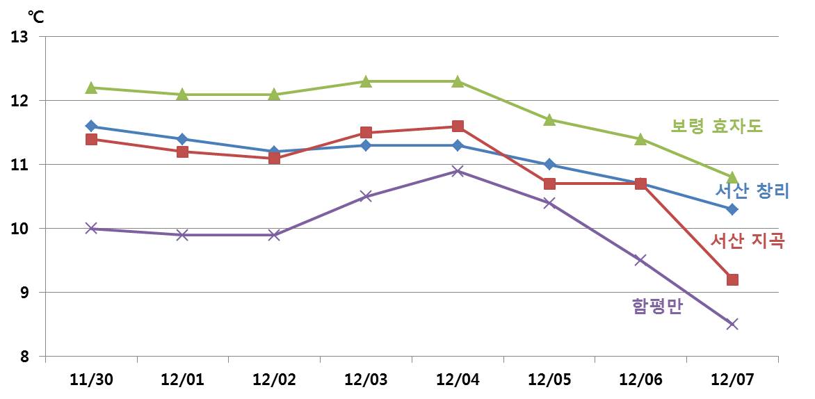 o 국립수산과학원의 실시간 해양환경 어장정보시스템 관측 자료 분석 결과, 서해 가로림만 내측(서산 지곡), 천수만 내측(서산 창리) 및 입구(보령 효자도), 함평만에서의 최근 7일간 수온(일평균)변동 경향은 아래와 같습니다 (11.30∼12.7).