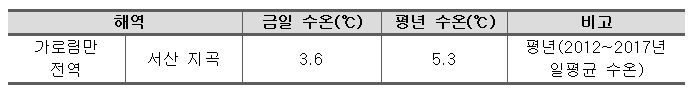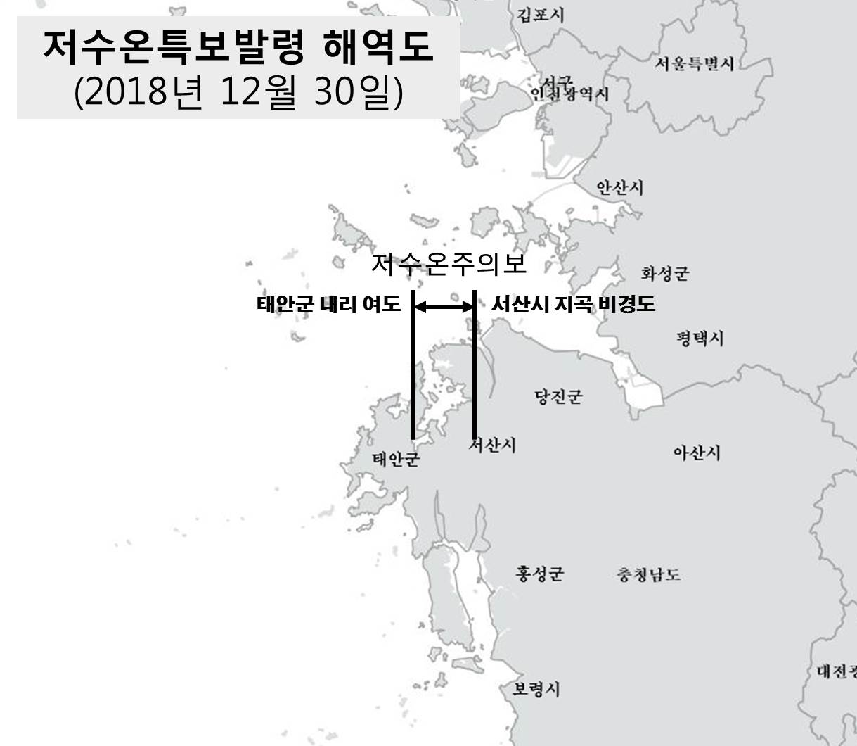 ※ 12월 30일, 00:00~14:00 평균 수온 ο 진행상황 금일 충남 가로림만 수온은 2.0~5.2℃로 전일에 비하여 0.5℃ 하강하였음. ο 특보상황 - 저수온 주의보 발령 (2018. 12. 28, 14:00) · 충남 가로림만 (태안군 내리 여도 서단~서산시 지곡 비경도 동단) ο 금후전망 - 이번 한파는 내일부터 소강상태를 보이겠지만, 가로림만의 수온은 다음 주 중반까지 지속적으로 하강경향을 보일 것으로 판단됨. - 서해남부 내만/천수만의 수온도 서서히 하강하고 있어 다음 주 수온변동 추이를 보고 특보 발령을 검토할 예정임. ο 당부사항 - 수산사무소 및 지자체에서는 저수온 기동 예찰 및 현장 지도활동에 철저를 기해 주시기 바라며, - 특보 발령해역의 어업인께서는 양식장 관리요령에 따라 양식장 관리에 철저를 기해주시기 바랍니다. ο 저수온 특보 발령 해역도