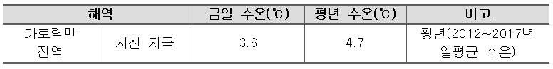 ※ 01월 05일, 00:00~14:00 평균 수온 ο 진행상황 - 금일 충남 가로림만 수온은 2.2~5.6℃로 전일과 비슷한 수온을 보이고 있음. ο 특보상황 - 저수온 주의보 발령 (2018. 12. 28, 14:00) · 충남 가로림만 (태안군 내리 여도 서단~서산시 지곡 비경도 동단) ο 금후전망 - 기상청은 다음주 화요일까지 평년 기온을 보일 것으로 예측하고 있어, 가로림만의 수온도 당분간 현재 수준에서 큰 변화가 없을 것으로 전망됨. - 충남 천수만 등 일부 내만의 수온은 지속적으로 서서히 하강하는 경향을 보이고 있어, 다음주 수온 변동 추이를 분석 후 확대를 검토할 예정임. ο 당부사항 - 수산사무소 및 지자체에서는 저수온 기동 예찰 및 현장 지도활동에 철저를 기해 주시기 바라며, - 특보 발령해역의 어업인께서는 양식장 관리요령에 따라 양식장 관리에 철저를 기해주시기 바랍니다. ο 저수온 특보 발령 해역도
