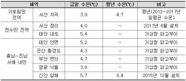 ο 저수온 발생 현황 - 조사월일 : 2019년 01월 07일(월) - 저수온 해역: ※ 01월 07일, 00:00~13:00 평균 수온 ο 진행상황 - 충남 가로림만 : 2.3~6.0℃로 전일과 비슷한 수온을 보이고 있음. - 충남 천수만 : 4.0(내측)~5.8(입구)℃의 수온 분포를 보이고 있음. - 서해 내만(충남~전남) : 3.8~5.7℃의 수온 분포를 보이고 있음. ο 특보상황 - 저수온 주의보 신규 발령 (2019. 1. 7, 14:00) · 충남 천수만 (서산시 창리 남측 횡단~보령시 원산도 남측 횡단) · 충남~전남 서해 내만 (태안군 군계 북방~목포시 달리도 남방) (외해역 제외) - 저수온 주의보 발령 · 충남 가로림만 (태안군 내리 여도 서단~서산시 지곡 비경도 동단) (18.12.28 발령) ο 금후전망 - 기상청에서는 수요일경 한파 발생 이후 평년 기온을 회복할 것으로 전망하고 있음. - 대조기의 영향으로 조석주기에 따라 일시적으로 수온이 하강할 수 있음. - 이번 주에도 특보 발령해역을 중심으로 수온은 서서히 하강할 것으로 판단됨. ο 당부사항 - 수산사무소 및 지자체에서는 저수온 기동 예찰 및 현장 지도활동에 철저를 기해 주시기 바라며, - 특보 발령해역의 어업인께서는 양식장 관리요령에 따라 양식장 관리에 철저를 기해주시기 바랍니다. ο 저수온 특보 발령 해역도