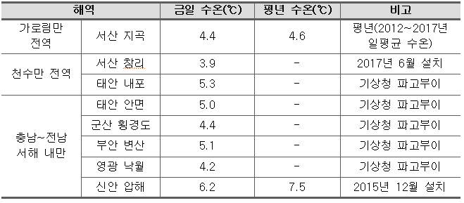 ※ 01월 12일, 00:00~14:00 평균 수온 ο 진행상황 - 충남 가로림만 : 3.8~5.7℃로 전일에 비하여 약간 상승하였음. - 충남 천수만 : 3.9(내측)~5.8(입구)℃로 전일과 비슷한 수온 분포를 보이고 있음. - 서해 내만(충남~전남) : 4.2~6.2℃로 전일에 비하여 약간 상승하였음. ο 특보상황 - 저수온 주의보 발령 · 충남 천수만 (서산시 창리 남측 횡단~보령시 원산도 남측 횡단) (01.07 발령) · 충남~전남 서해 내만 (태안군 군계 북방~목포시 달리도 남방) (외해역 제외) (01.07 발령) · 충남 가로림만 (태안군 내리 여도 서단~서산시 지곡 비경도 동단) (18.12.28 발령) ο 금후전망 - 평년대비 높은 기온을 나타내고, 소조기에 접어들면서 수온하강이 소강상태를 보이고 있음. - 다음주 초까지 뚜렷한 한파 예보가 없어 현재와 비슷한 수온분포를 나타낼 것으로 판단됨.