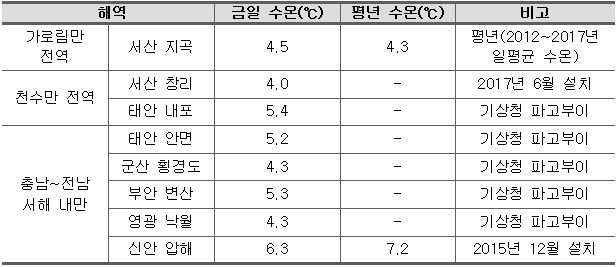 ο 저수온 발생 현황 - 조사월일 : 2019년 01월 14일(월) - 저수온 해역: ※ 01월 14일, 00:00~14:00 평균 수온 ο 진행상황 - 충남 가로림만 : 4.0~5.4℃로 전일과 비슷한 수온 분포를 보이고 있음. - 충남 천수만 : 4.0(내측)~5.4(입구)℃로 전일과 비슷한 수온 분포를 보이고 있음. - 서해 내만(충남~전남) : 4.3~6.3℃로 전일과 비슷한 수온 분포를 보이고 있음. ο 특보상황 - 저수온 주의보 발령 · 충남 천수만 (서산시 창리 남측 횡단~보령시 원산도 남측 횡단) (01.07 발령) · 충남~전남 서해 내만 (태안군 군계 북방~목포시 달리도 남방) (외해역 제외) (01.07 발령) · 충남 가로림만 (태안군 내리 여도 서단~서산시 지곡 비경도 동단) (18.12.28 발령) ο 금후전망 - 내일 오후부터 수요일까지 일시적으로 기온이 떨어지고 바람이 강하게 불 것으로 전망되어, 금주 수요일(‘19.1.16) 경에 현재 수온에서 0.5℃ 내외로 일시적인 하강 가능성이 있음. - 수요일 이후에는 뚜렷한 한파 예보가 없어 현재와 비슷한 수온분포를 나타낼 것으로 판단됨. ο 당부사항 - 수산사무소 및 지자체에서는 저수온 기동 예찰 및 현장 지도활동에 철저를 기해 주시기 바라며, - 특보 발령해역의 어업인께서는 양식장 관리요령에 따라 양식장 관리에 철저를 기해주시기 바랍니다. ο 저수온 특보 발령 해역도
