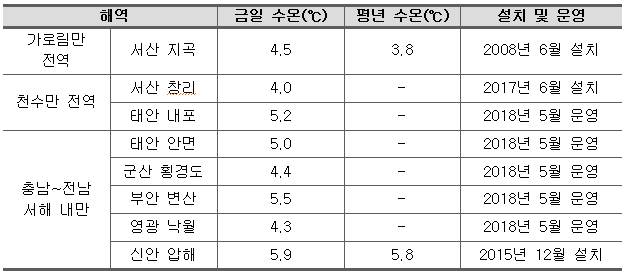 ※ 01월 20일, 00:00~14:00 평균 수온 ο 진행상황 - 충남 가로림만 : 4.5℃로 전일과 비슷한 분포를 보이고 있음. - 충남 천수만 : 4.0(내측)~5.6(입구)℃로 전일과 비슷한 수온 분포를 보이고 있음. - 서해 내만(충남~전남) : 4.3~5.9℃로 전일과 비슷한 수온 분포를 보이고 있음. ο 특보상황 - 저수온 주의보 발령 · 충남 천수만 (서산시 창리 남측 횡단~보령시 원산도 남측 횡단) (01.07 발령) · 충남~전남 서해 내만 (태안군 군계 북방~목포시 달리도 남방) (외해역 제외) (01.07 발령) · 충남 가로림만 (태안군 내리 여도 서단~서산시 지곡 비경도 동단) (18.12.28 발령) ο 금후전망 - 기상청에 따르면, 1월말까지 큰 한파의 우려는 없으며 평년 혹은 평년보다 약간 높은 기온을 보일 것으로 예보하고 있음. - 다음주 초까지 대조기의 영향으로 일시적인 수온하강이 나타날 수 있어 주의가 필요함. ο 당부사항 - 수산사무소 및 지자체에서는 저수온 기동 예찰 및 현장 지도활동에 철저를 기해 주시기 바라며, - 특보 발령해역의 어업인께서는 양식장 관리요령에 따라 양식장 관리에 철저를 기해주시기 바랍니다. ο 저수온 특보 발령 해역도
