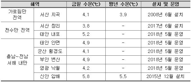 ο 저수온 발생 현황 - 조사월일 : 2019년 01월 21일(월) - 저수온 해역: ※ 01월 21일, 00:00~14:00 평균 수온 ο 진행상황 - 충남 가로림만 : 4.1℃로 전일에 비해 약간 수온이 하강하였음. - 충남 천수만 : 3.8(내측)~5.2(입구)℃로 전일과 비슷한 수온 분포를 보이고 있음. - 서해 내만(충남~전남) : 4.1~5.8℃로 전일과 비슷한 수온 분포를 보이고 있음. ο 특보상황 - 저수온 주의보 발령 · 충남 천수만 (서산시 창리 남측 횡단~보령시 원산도 남측 횡단) (01.07 발령) · 충남~전남 서해 내만 (태안군 군계 북방~목포시 달리도 남방) (외해역 제외) (01.07 발령) · 충남 가로림만 (태안군 내리 여도 서단~서산시 지곡 비경도 동단) (18.12.28 발령) ο 금후전망 - 금주는 평년과 비슷한 기온이 이어질 것으로 예보되어, 특보 발령해역은 평년과 비슷하거나 약간 높은 수온을 보일 것으로 전망됨. - 오늘부터 대조기에 접어들어 일시적인 수온하강이 나타날 수 있어 주의가 필요함. ο 당부사항 - 수산사무소 및 지자체에서는 저수온 기동 예찰 및 현장 지도활동에 철저를 기해 주시기 바라며, - 특보 발령해역의 어업인께서는 양식장 관리요령에 따라 양식장 관리에 철저를 기해주시기 바랍니다. ο 저수온 특보 발령 해역도