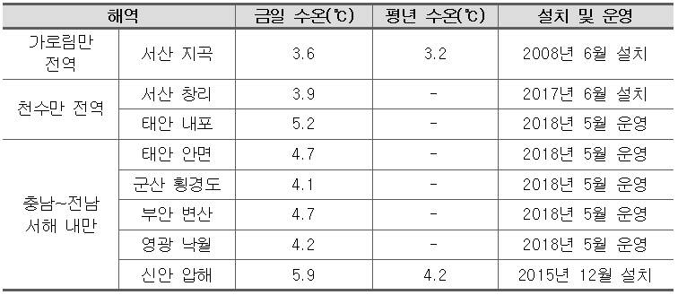 ※ 01월 26일, 00:00~14:00 평균 수온 ο 진행상황 - 충남 가로림만 : 3.6℃로 전일에 비하여 0.5~1.0℃ 수온이 하강하였음. - 충남 천수만 : 3.9(내측)~5.2(입구)℃로 전일에 비하여 소폭 수온이 하강하였음. - 서해 내만(충남~전남) : 4.1~5.9℃로 전일에 비하여 소폭 수온이 하강하였음. ο 특보상황 - 저수온 주의보 발령 · 충남 천수만 (서산시 창리 남측 횡단~보령시 원산도 남측 횡단) (01.07 발령) · 충남~전남 서해 내만 (태안군 군계 북방~목포시 달리도 남방) (외해역 제외) (01.07 발령) · 충남 가로림만 (태안군 내리 여도 서단~서산시 지곡 비경도 동단) (18.12.28 발령) ο 금후전망 - 다음 주까지 한두 차례 추위가 예보되어 있지만, 평년과 비슷하거나 약간 높은 기온을 보일 것으로 전망됨. - 다음 주 초까지 소폭 수온이 하강할 가능성은 있지만, 급격한 수온 하강은 나타나지 않을 것으로 전망됨. ο 당부사항 - 수산사무소 및 지자체에서는 저수온 기동 예찰 및 현장 지도활동에 철저를 기해 주시기 바라며, - 특보 발령해역은 장기간 저수온에 노출되어 있으므로, 어업인께서는 지속적으로 양식장 관리에 철저를 기해주시기 바랍니다.