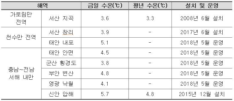 ※ 01월 27일, 00:00~14:00 평균 수온 ο 진행상황 - 충남 가로림만 : 3.6℃로 전일과 비슷한 수온 분포를 보이고 있음. - 충남 천수만 : 3.9(내측)~5.1(입구)℃로 전일과 비슷한 수온 분포를 보이고 있음. - 서해 내만(충남~전남) : 3.8~5.7℃로 전일과 비슷하거나 소폭 수온이 하강하였음. ο 특보상황 - 저수온 주의보 발령 · 충남 천수만 (서산시 창리 남측 횡단~보령시 원산도 남측 횡단) (01.07 발령) · 충남~전남 서해 내만 (태안군 군계 북방~목포시 달리도 남방) (외해역 제외) (01.07 발령) · 충남 가로림만 (태안군 내리 여도 서단~서산시 지곡 비경도 동단) (18.12.28 발령) ο 금후전망 - 다음 주 간헐적으로 짧은 추위가 있지만 대체로 평년과 비슷하거나 약간 높은 기온을 보일 것으로 전망하고 있음. - 다음 주에는 현재와 비슷하거나 소폭 수온 하강 가능성은 있지만, 급격한 수온 하강은 나타나지 않을 것으로 판단됨. ο 당부사항 - 수산사무소 및 지자체에서는 저수온 기동 예찰 및 현장 지도활동에 철저를 기해 주시기 바라며, - 특보 발령해역의 어업인께서는 양식장 관리요령에 따라 양식장 관리에 철저를 기해주시기 바랍니다.