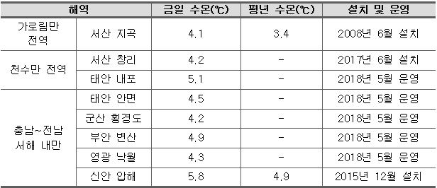 ο 저수온 발생 현황 - 조사월일 : 2019년 01월 31일(목) - 저수온 해역: ※ 01월 31일, 00:00~14:00 평균 수온 ο 진행상황 - 충남 가로림만 : 4.1℃로 전일에 비하여 약간 수온이 상승하였음. - 충남 천수만 : 4.2(내측)~5.1(입구)℃로 전일과 비슷한 수온 분포를 보이고 있음. - 서해 내만(충남~전남) : 4.2~5.8℃로 전일과 비슷한 수온 분포를 보이고 있음. ο 특보상황 - 저수온 주의보 발령 · 충남 천수만 (서산시 창리 남측 횡단~보령시 원산도 남측 횡단) (01.07 발령) · 충남~전남 서해 내만 (태안군 군계 북방~목포시 달리도 남방) (외해역 제외) (01.07 발령) · 충남 가로림만 (태안군 내리 여도 서단~서산시 지곡 비경도 동단) (18.12.28 발령) ο 금후전망 - 내일(’19.2.1)까지 짧은 추위 이후 주말동안 평년보다 높은 기온을 보일 것으로 전망되며, 같은 시기에 소조기 영향을 받을 것으로 판단됨. - 수온은 내일 오전까지 소폭 하강이 예상되나, 그 이후 당분간 큰 변동이 없거나 소폭 상승할 것으로 판단됨. ο 당부사항 - 수산사무소 및 지자체에서는 저수온 기동 예찰 및 현장 지도활동에 철저를 기해 주시기 바라며, - 특보 발령해역의 어업인께서는 양식장 관리요령에 따라 양식장 관리에 철저를 기해주시기 바랍니다. ο 저수온 특보 발령 해역도