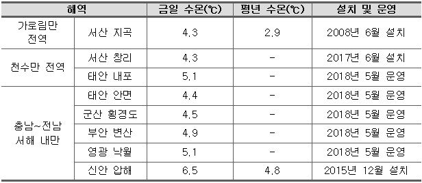 ο 저수온 발생 현황 - 조사월일 : 2019년 02월 07일(목) - 저수온 해역: ※ 02월 07일, 00:00~14:00 평균 수온 ο 진행상황 - 충남 가로림만 : 4.3℃로 전일에 비하여 소폭 수온이 상승하였음. - 충남 천수만 : 4.3(내측)~5.1(입구)℃로 전일과 비슷한 수온을 보이고 있음. - 서해 내만(충남~전남) : 4.4~6.5℃로 전일에 비하여 소폭 수온이 상승하였음. ο 특보상황 - 저수온 주의보 발령 · 충남 천수만 (서산시 창리 남측 횡단~보령시 원산도 남측 횡단) (01.07 발령) · 충남~전남 서해 내만 (태안군 군계 북방~목포시 달리도 남방) (외해역 제외) (01.07 발령) · 충남 가로림만 (태안군 내리 여도 서단~서산시 지곡 비경도 동단) (18.12.28 발령) ο 금후전망 - 금일 오후부터 다음 주 초까지 추위가 예보되어 있으며, 특보 발령 해역의 수온도 하강 경향을 보일 것으로 전망됨. - 이번 주까지 대조기 영향으로 조석간만 및 조류에 의한 일수온 변동이 크게 나타날 수 있음. ο 당부사항 - 수산사무소 및 지자체에서는 저수온 기동 예찰 및 현장 지도활동에 철저를 기해 주시기 바라며, - 특보 발령해역의 어업인께서는 양식장 관리요령에 따라 양식장 관리에 철저를 기해주시기 바랍니다. ο 저수온 특보 발령 해역도