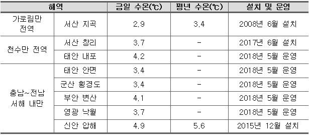 ο 저수온 발생 현황 - 조사월일 : 2019년 02월 15일(금) - 저수온 해역: ※ 02월 15일, 00:00~14:00 평균 수온 ο 진행상황 - 충남 가로림만 : 2.9℃로 전일에 비해 소폭 수온이 상승하였음. - 충남 천수만 : 3.7(내측)~4.2(입구)℃로 전일과 비슷한 수온분포를 보이고 있음. - 서해 내만(충남~전남) : 3.4~4.9℃로 전일과 비슷한 수온분포를 보이고 있음. ο 특보상황 - 저수온 경보 발령 · 충남 가로림만 (태안군 내리 여도 서단~서산시 지곡 비경도 동단) (02.11 발령) · 충남 천수만 (서산시 창리 남측 횡단~보령시 원산도 남측 횡단) (02.11 발령) - 저수온 주의보 발령 · 충남~전남 서해 내만 (태안군 군계 북방~목포시 달리도 남방) (외해역 제외) (01.07 발령) ο 금후전망 - 내일(‘19.2.16) 오전까지 평년과 비슷한 기온 분포를 보인 후 오후부터 다음 주 월요일(’19.2.18)까지 짧은 추위가 찾아올 것으로 예보되어, 수온도 현재와 비슷한 수준에서 소폭 등락할 것으로 전망됨. - 소조기의 영향으로 급격한 수온 변동은 나타나지 않을 것으로 판단됨. ο 당부사항 - 수산사무소 및 지자체에서는 저수온 기동 예찰 및 현장 지도활동에 철저를 기해 주시기 바라며, - 다음 주 초까지 수온이 하강할 가능성이 있어 특보 발령해역의 양식어업인께서는 양식장 관리요령에 따라 양식장 관리에 철저를 기해주시기 바랍니다. ο 저수온 특보 발령 해역도