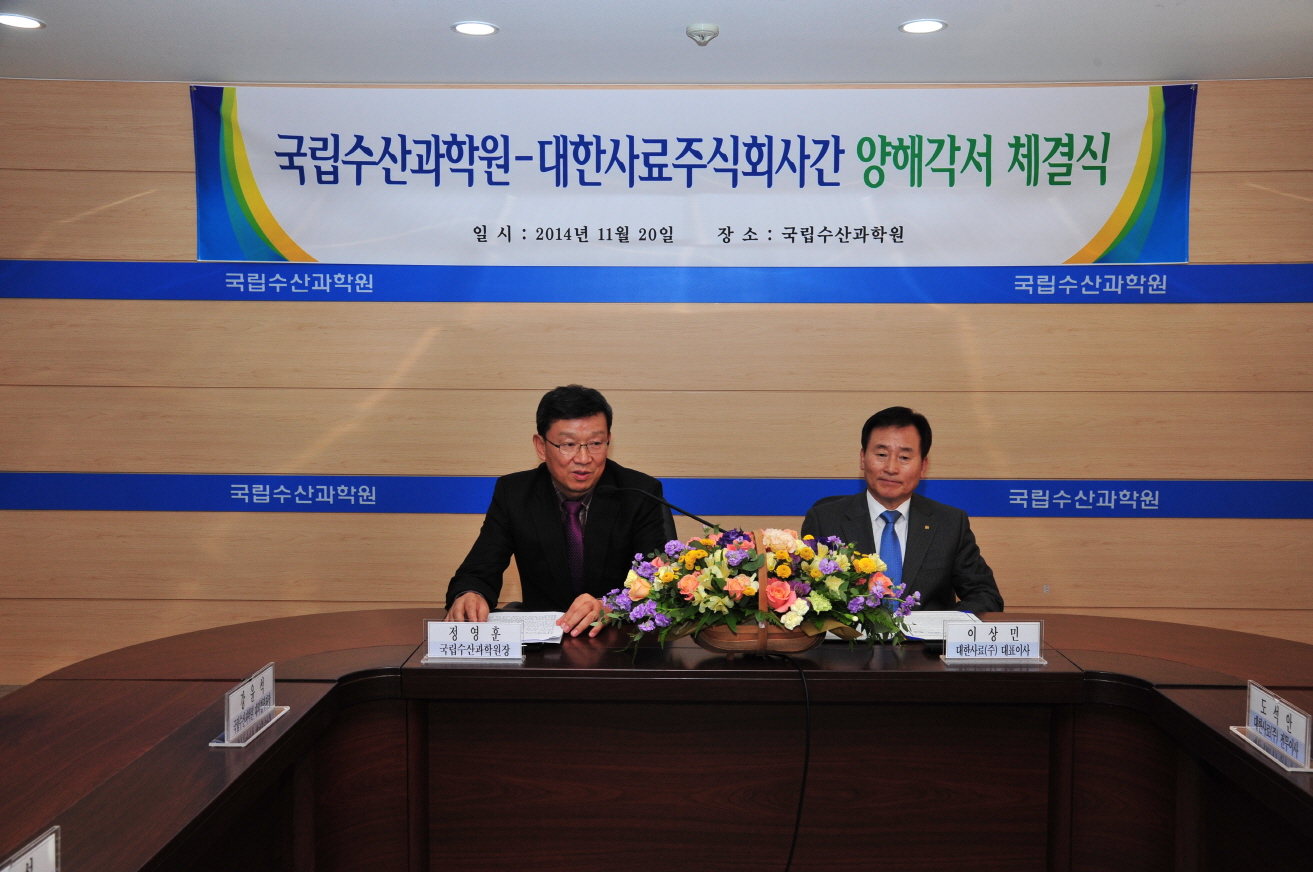 The NFRDI signed a MOU with the DAEHAN FEED on November 20 to produce better formulated feed for aquaculture species.