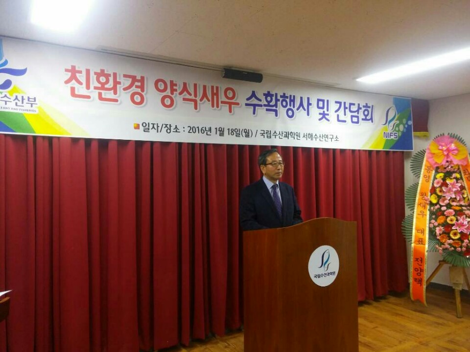 The West Sea Fisheries Research Institute of NIFS had a harvest event of cultured eco-friendly shrimp on January 18,2015 with about 50 participants of fish farmers, trainees for start-up and seed producers.