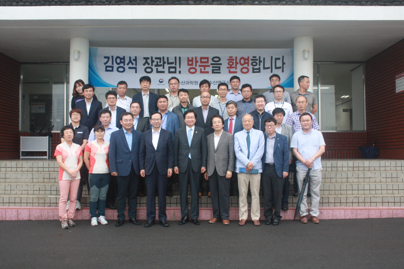 Minister Kim,Youngseok of the Ministry of Oceans and Fisheries visited the Jeju Fisheries Research Institute with president Kang, Joonsuk of NIFS to see the status of blue fin tuna farming and have a meeting with responsible researchers.
