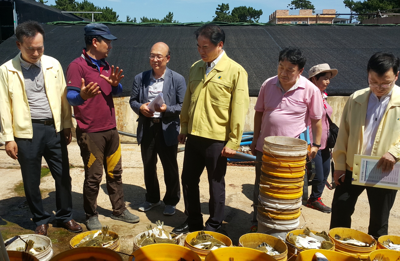 Acting president of NIFS visited culture farms in Pohang and checked facilities on August 6. He heard voices from fields, met with officials from the local government to check the damages caused by high water temperature and discussed countermeasures against it. |