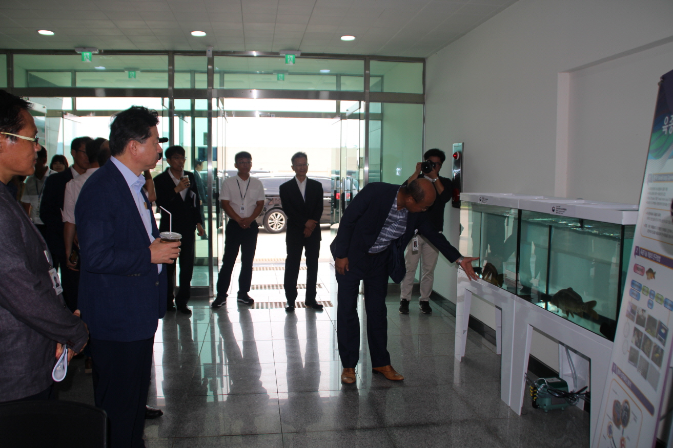 Minister of Oceans and Fisheries visited the Inland Fisheries Research Institute on August 19. He not only received a briefing about the institute\'s efforts to promote inland culture industry by developing new culture species and high-end culture technology but also encouraged the members for their hard work. |