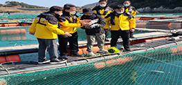 The president of the National Institute of Fisheries Science (NIFS) visited the South Sea Fisheries Research Institute for the work report and checked the wintering site of cultivated hybrid groupers on March 7.