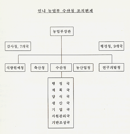 중앙행정조직은 농업부 수산청으로서 청장은 차관보급임.