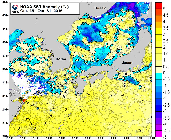 광역 위성영상 합성 표면수온 분포도 (2016.10.25 ~ 2016.10.31) ◦「평년에 비해」 대화퇴 근해 0.5도 높게, 울릉도-독도 근해 0.5도 높게, 대마도 근해 0.5도 높게, 제주도 근해 비슷하게, 이어도 근해 1도 낮게, 가거초 근해 0.5도 높게, 어청도 근해 0.5도 높게 나타날 것으로 예상됩니다. NOAA 위성영상 표면수온 평년편차 분포도 (2016.10.25 ~ 2016.10.31) ◦「작년에 비해」 대화퇴 근해 3도 높게, 울릉도-독도 근해 2도 높게, 대마도 근해 0.5도 높게, 제주도 비슷하게, 이어도 근해 2도 낮게, 가거초 0.5도 낮게, 어청도 근해 1도 낮게, 백령도 비슷하게 나타날 것으로 예상됩니다. 광역 위성영상 합성 표면수온 분포도 (2015.10.27 ~ 2015.11.02)