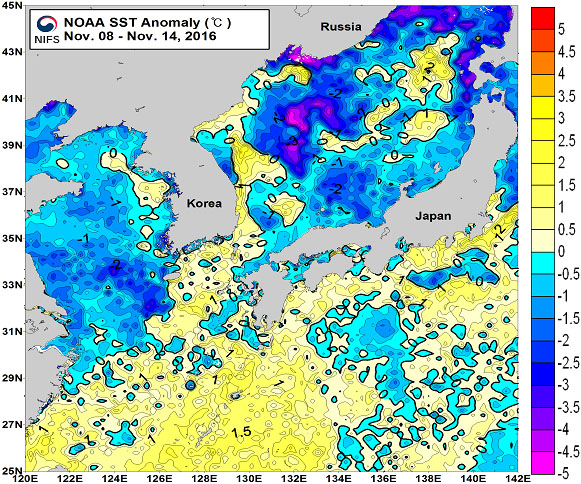 ◦「평년에 비해」 대화퇴 근해 1도 낮게, 울릉도-독도 근해 0.5도 낮게, 대마도 근해 0.5도 높게, 제주도 근해 0.5도 높게, 이어도 근해 1도 낮게, 가거초 근해 0.5도 낮게, 어청도 근해 0.5도 낮게 나타날 것으로 예상됩니다. NOAA 위성영상 표면수온 평년편차 분포도 (2016. 11. 08 ~ 2016. 11. 14) ※ 위 그림은 NOAA 위성에서 관측한 한반도 주변해역 표면수온 영상의 평년(1990-2015년) 에 대한 편차 분포를 나타냅니다.