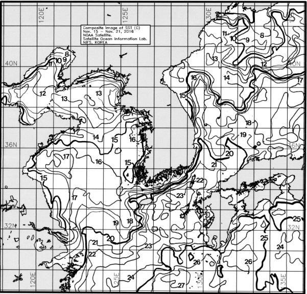광역 위성영상 합성 표면수온 분포도 (2016. 11. 15 ~ 2016. 11. 21)